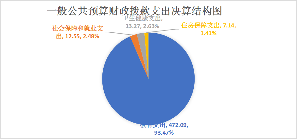 2024年度一般公共预算财政拨款支出505.05万元,主要用于以下方面: 教育支出472.09万元,占93.47%;社会保障和就业支出12.55万元,占2.48%;卫生健康支出13.27万元,占2.63%;住房保障支出7.14万元,占1.41%。