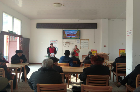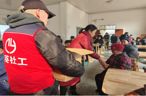图为:社工和敬老院工作人员在为老年人发放奖励