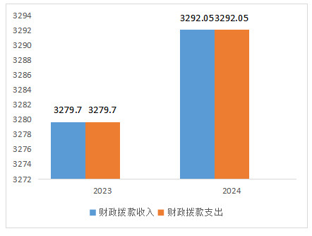 2024年财政拨款收入总计3292.05,3279.7万元。与2023年相比,财政拨款收入总计增加12.35万元,增加0.38%;2023年财政拨款支出总计3292.05万元。与2023年相比,财政拨款支出总计各减少12.35万元,增加0.38%。主要变动原因是财政拨款收入增加。