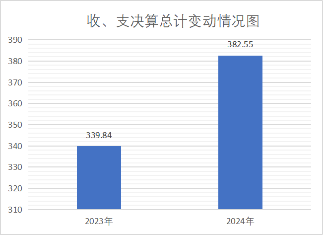 2024年度收、支总计均为382.55万元。与2023年度相比,收、支总计各增加42.71万元,增加12.57%。主要变动原因是结转2023年工程剩余未付资金。