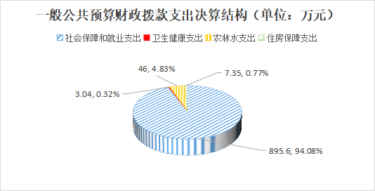 2024年度一般公共预算财政拨款支出951.99万元,主要用于以下方面:社会保障和就业支出895.6万元,占94.08%;卫生健康支出3.04万元,占0.32%;农林水支出46万元,占4.83%;住房保障支出7.35万元,占0.77%。
