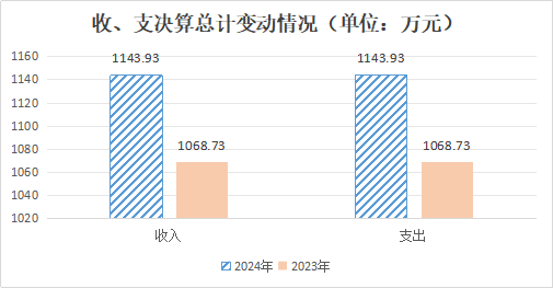 2024年度收、支总计均为1143.93万元。与2023年度相比,收、支总计各增加75.2万元,增长7.04%。主要变动原因是残疾人康复服务费用增加。