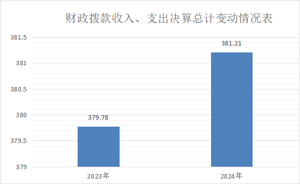 2024年财政拨款收支总计381.21万元,2023年财政拨款收支总计379.78万元。与2023年相比,收、支总计增加1.43万元,增加0.38%。主要变动原因是2024年度人员增资。