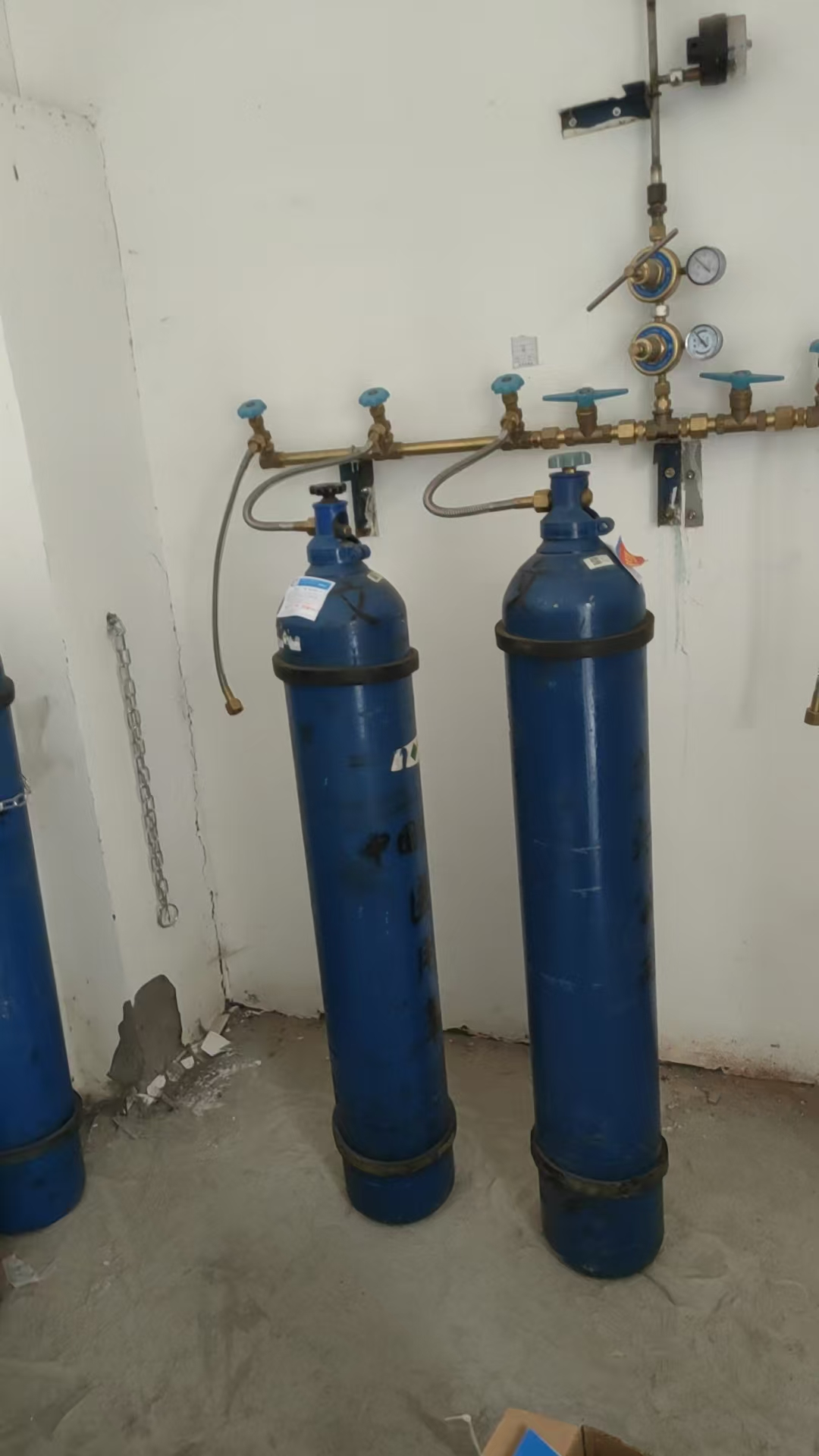 隐患案例一:氧气房部分氧气瓶未采取防倾倒措施。