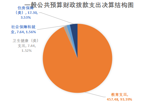 2024年一般公共预算财政拨款支出489.86万元,主要用于以下方面:教育支出(类)457.48万元,占93.39%;社会保障和就业(类)支7.64万元,占1.56%;卫生健康支出7.44万元,占1.52%;住房保障支出17.3万元,占3.53%。