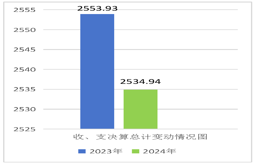 2024年度收、支总计均为2534.94万元。与2023年度相比,收、支总计各减少18.99万元,下降0.74%。主要变动原因是项目资金减少。