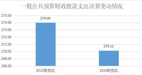 2024年度一般公共预算财政拨款支出270.11万元,占本年支出合计的99.89%。与2023年度相比,一般公共预算财政拨款支出减少3.89万元,下降1.42%。主要变动原因是办公人员减少、厉行节约,缩减办公经费。