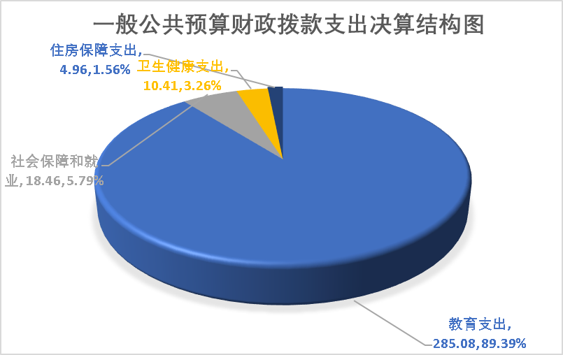 2023年一般公共预算财政拨款支出318.91万元,主要用于以下方面:教育支出(类)285.08万元,占85.63%;社会保障和就业(类)支出18.46万元,占5.55%;卫生健康(类)支出10.41万元,占3.13%;住房保障(类)支出4.96万元,占1.56%。
