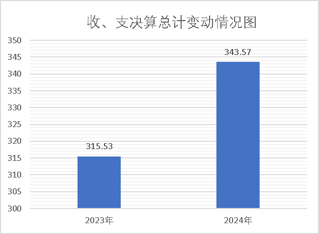 2024年度收、支总计343.57万元。与2023年315.53万元相比,收、支总计各增加了28.04万元,增加了8.89%。主要变动原因是学校2024年新增了校舍维修项目和发放退休人员一次性补助金。