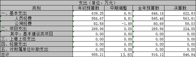 2024年度一般公共预算财政拨款支出846.84万元,占本年支出合计的100%。与2023年度相比,一般公共预算财政拨款支出减少143.48万元,下降14.49%。主要变动原因是在编在职人数减少,年终项目经费由财政统筹支出。