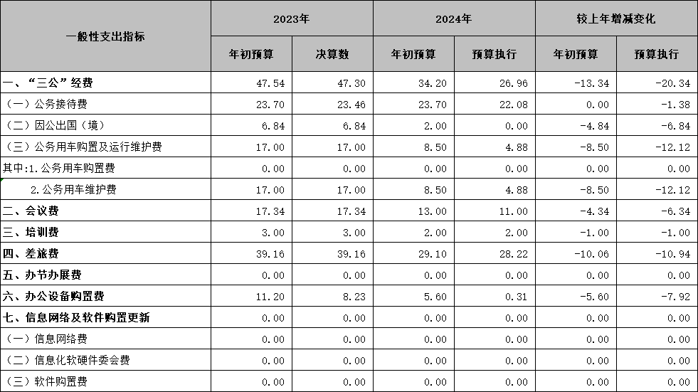 2024年度“三公”经费财政拨款支出决算为26.96万元,完成预算79%,较上年度减少20.34万元,下降43%。决算数小于预算数的主要原因是财政预算减少,2024年无因公出国(境)费,严格执行政府过紧日子基本方针,厉行节约,从严从紧办事。