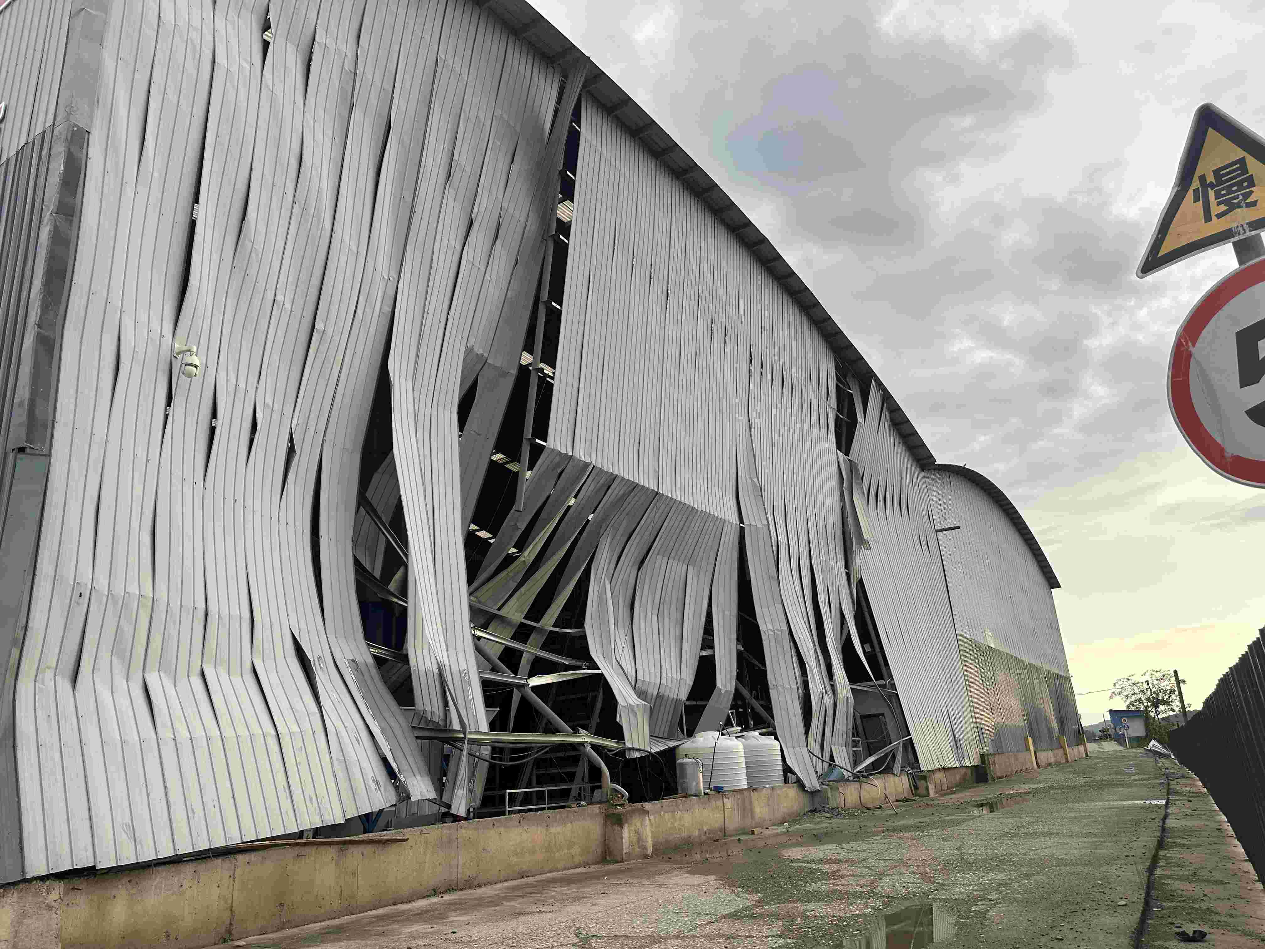 厂房部分结构被风吹烂,墙体有破损,可能发生坍塌等危险。