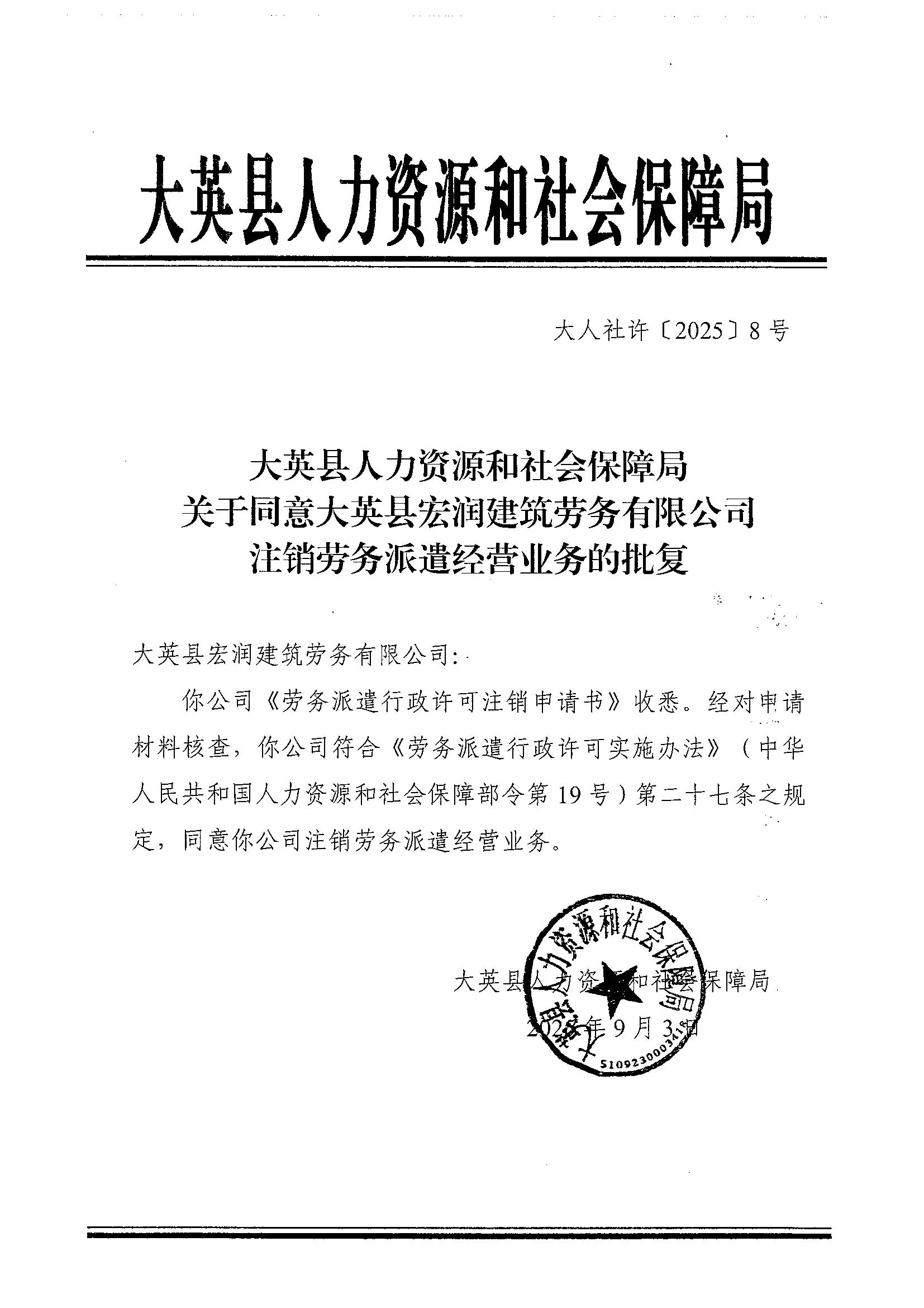 大英县人力资源和社会保障局关于同意大英县宏润建筑劳务有限公司 注销劳务派遣经营业务的批复