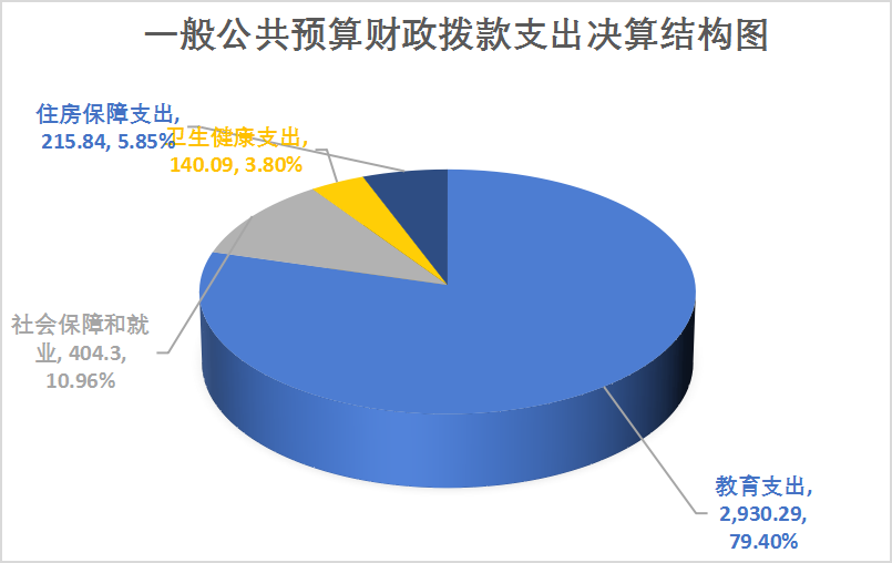 2024年一般公共预算财政拨款支出3,690.52万元,主要用于以下方面:教育支出(类)2,930.29 万元,占79.40%;社会保障和就业(类)支出404.30万元,占10.96%;卫生健康(类)支出140.09 万元,占3.80%;住房保障(类)支出215.84万元,占5.85%。