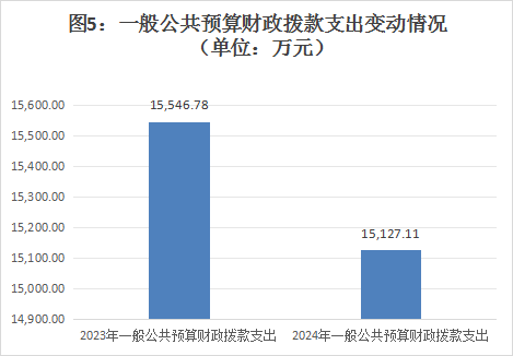 2024年度一般公共预算财政拨款支出15,127.11万元,占本年支出合计的24.13%。与2023年度相比,一般公共预算财政拨款支出减少419.67万元,下降2.70%。主要原因是本年度疫情防控结算资金减少,以后年度逐年递减,直至结算完成。