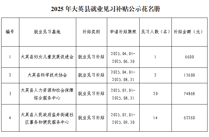根据《四川省人力资源和社会保障厅关于进一步做好就业见习工作的通知》(川人社办发〔2025〕20号)相关规定,经我局认真审核,拟对4个见习基地发放就业见习补贴,现将补贴情况(名单附后)予以公示,公示期3个工作日,公示期间接受社会监督,对公示若有异议,请在公示期间实名向我局反映。