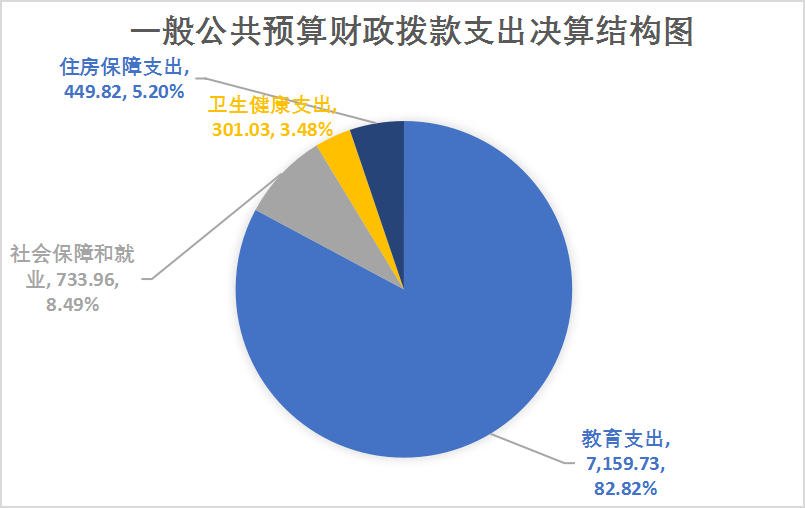 2024年一般公共预算财政拨款支出8,644.55万元,主要用于以下方面:教育支出(类)7,159.73万元,占82.82%;社会保障和就业(类)支出733.96万元,占8.49%;卫生健康(类)支出301.03万元,占3.48%;住房保障(类)支出449.82万元,占5.20%。