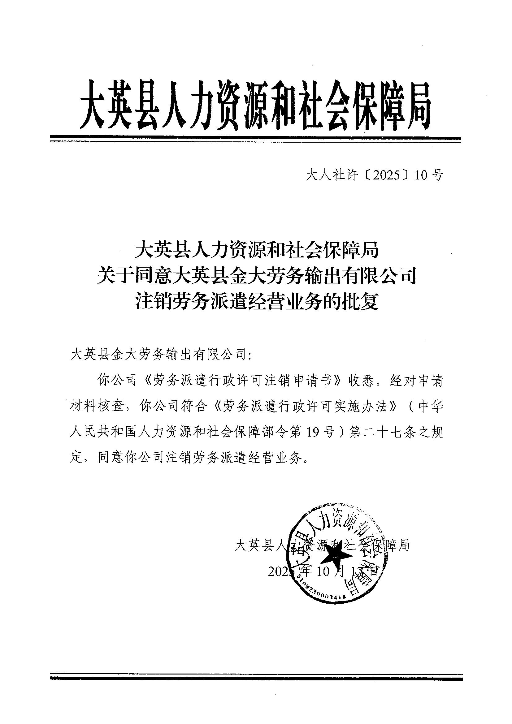 大英县人力资源和社会保障局关于同意大英县金大劳务输出有限公司注销劳务派遣经营业务的批复