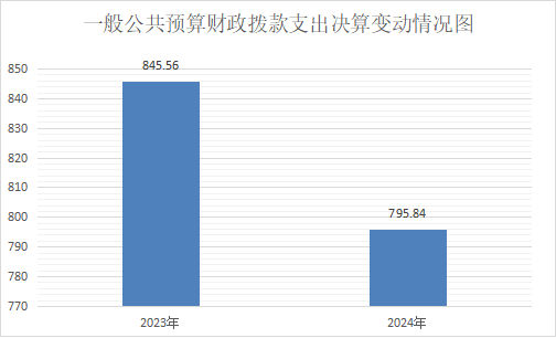 2024年一般公共预算财政拨款支出795.84万元,占本年支出合计的100%。与2023年相比,一般公共预算财政拨款减少49.72万元,降低5.88%。主要变动原因是学生人数减少和建设项目拨款减少。(图5:一般公共预算财政拨款支出决算变动情况)(柱状图)