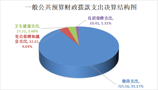 教育支出(类)725.56万元,占91.17%%;社会保障和就业(类)支出32.15万元,占4.04%%;卫生健康支出27.72万元,占3.48%:住房保障支出10.41万元,占1.31%。