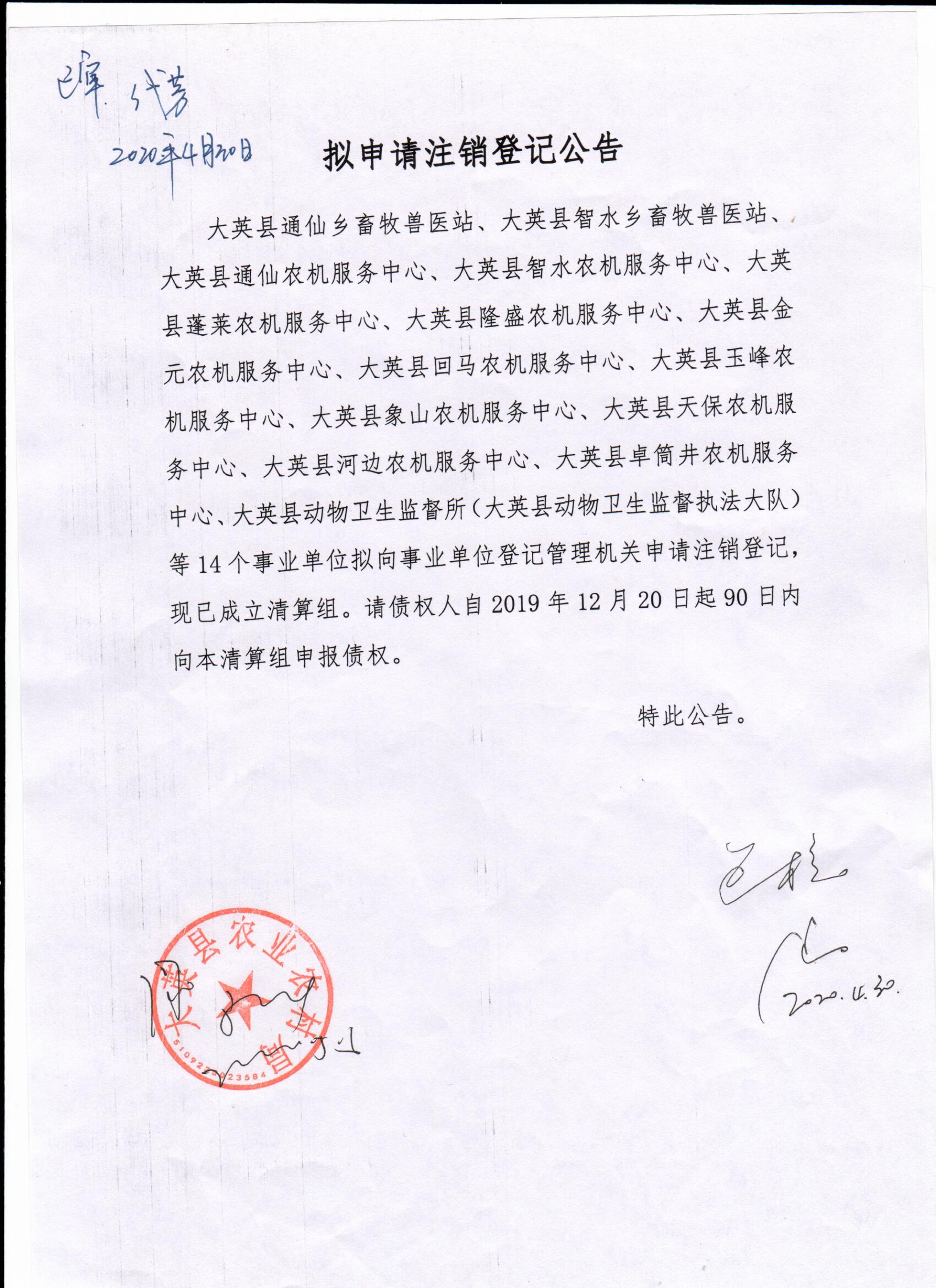 大英县通仙乡畜牧兽医站、大英县智水乡畜牧兽医站、大英县通仙农机服务中心、大英县智水农机服务中心、大英县蓬莱农机服务中心、大英县隆盛农机服务中心、大英县金元农机服务中心、大英县回马农机服务中心、大英县玉 峰农机服务中心、大英县象山农机服务中心、大英县天保农机服务中心、大英县河边农机服务中心、大英县卓筒井农机服务中心、大英县动物卫生监督所(大英县动物卫生监督执法大队)等14个事业单位拟向事业单位登记管理机关申请注销登记,现已成立清算组。请债权人自2019年12月20日起90日内向本清算组申报债权。
