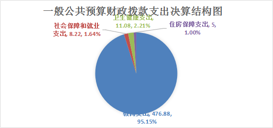 2024年度一般公共预算财政拨款支出501.18万元,主要用于以下方面: 教育支出476.88万元,占95.15%;社会保障和就业支出8.22万元,占1.64%;卫生健康支出11.08万元,占2.21%;住房保障支出5万元,占1%。