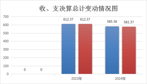 2024年度收、支总计均为585.36万元、581.37万元。与2023年度收、支612.37万元、612.37万元相比,收、支总计各减少27.01万元、31万元,收、支下降4.41%、5.06%。主要变动原因幼儿学生减少、对应收支减少。