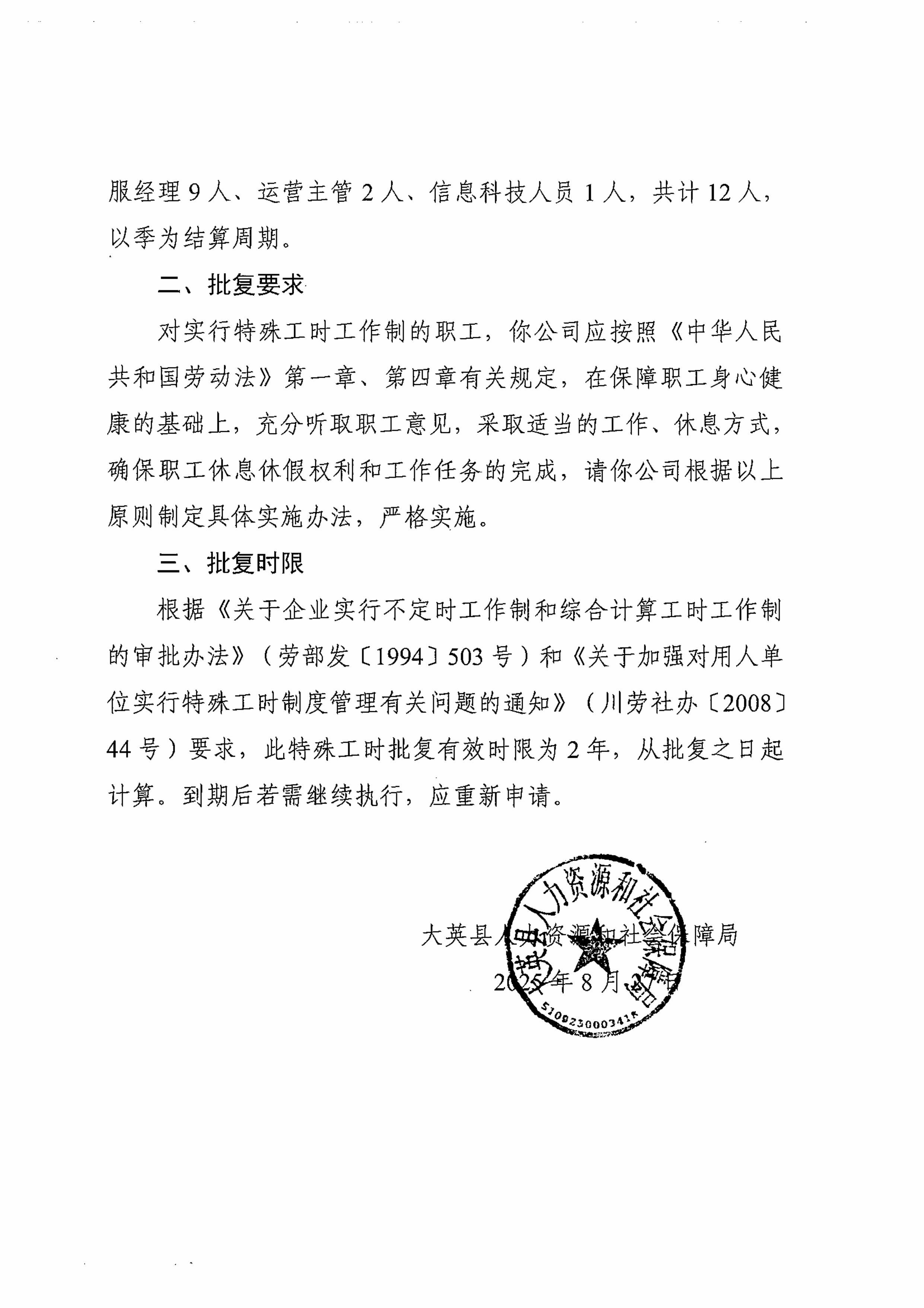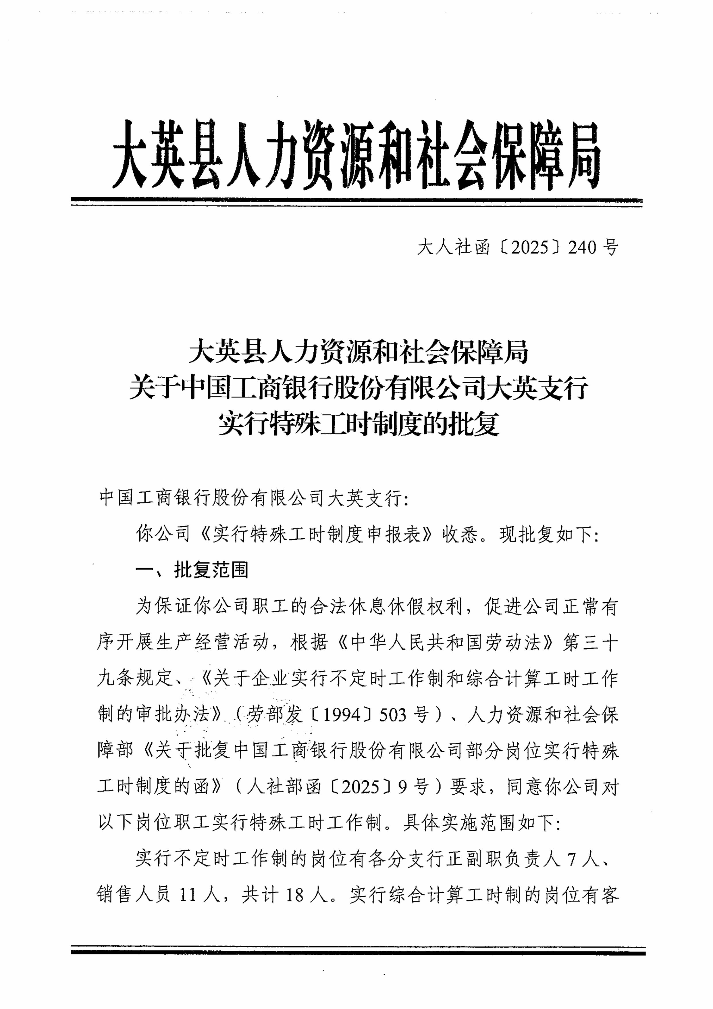 大英县人力资源和社会保障局关于中国工商银行股份有限公司大英支行实行特殊工时制度的批复