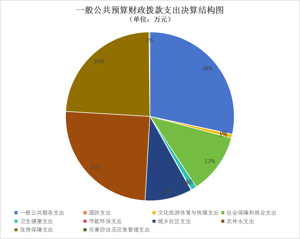2024年一般公共预算财政拨款支出4764.11万元,主要用于以下方面:一般公共服务支出1352.57万元,占28.39%;国防支出2万元,占0.04%;文化旅游体育与传媒支出33.5万元,占0.7%,社会保障和就业支出552.07万元,占11.59%;卫生健康支出50.08万元,占1.05%;节能环保支出5万元,占0.11%;城乡社区支出430.33万元,占9.03%;农林水支出1192.38万元,占25.03%;住房保障支出1138.19万元,占23.89%;灾害防治及应急管理支出8万元,占0.17%。