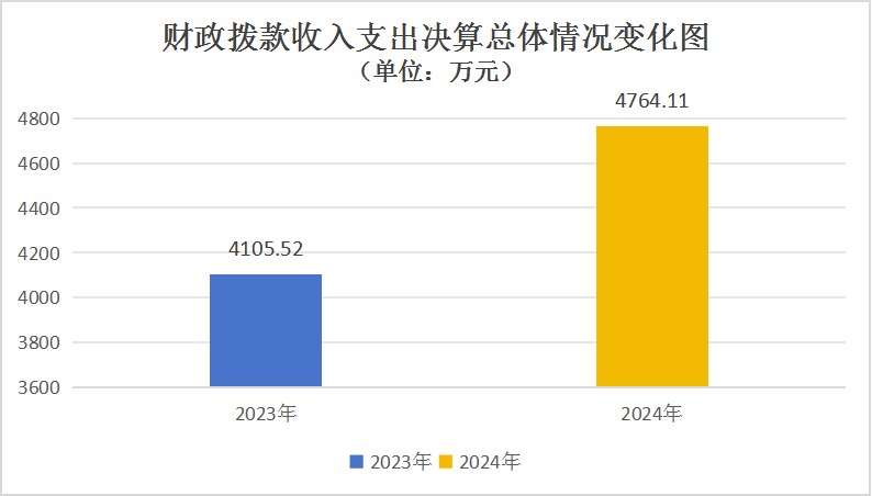 2024年财政拨款收、支总计4764.11万元。与2023年相比,财政拨款收、支总计各增加658.59万元,增加16.04%。主要变动原因是一般公共服务支出项目支出增加。