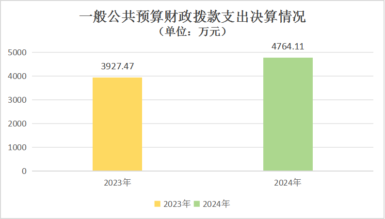 2024年一般公共预算财政拨款支出4764.11万元,占本年支出合计的36.8%。与2023年相比,一般公共预算财政拨款支出增加836.64万元,增加21.3%。主要变动原因是一般公共服务支出项目支出增加。