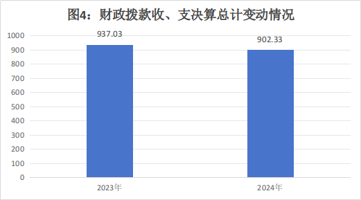 2024年度财政拨款收、支总计均为902.33万元。与2023年度相比,财政拨款收、支总计各减少34.7万元,下降3.7%。主要变动原因是人员减少。