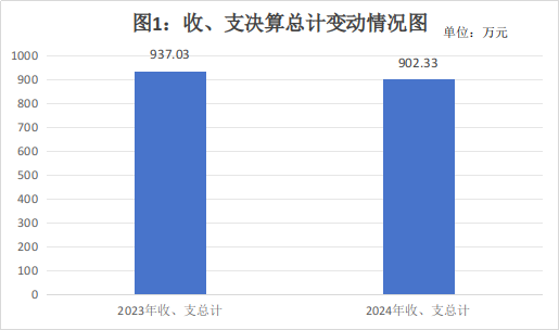 2024年度收、支总计均为902.33万元。与2023年度相比,收、支总计各减少34.7万元,下降3.7%。主要变动原因是人员减少。