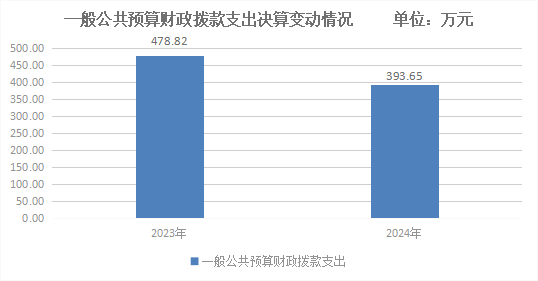 2024年度一般公共预算财政拨款支出393.65万元,占本年支出合计的100%。与2023年度相比,一般公共预算财政拨款支出减少85.17万元,下降21.64%。主要变动原因是:一是本年度较上年度人员减少4名,减少人员经费;二是上年度追加2022年度巡察项目经费差口,本年度无。