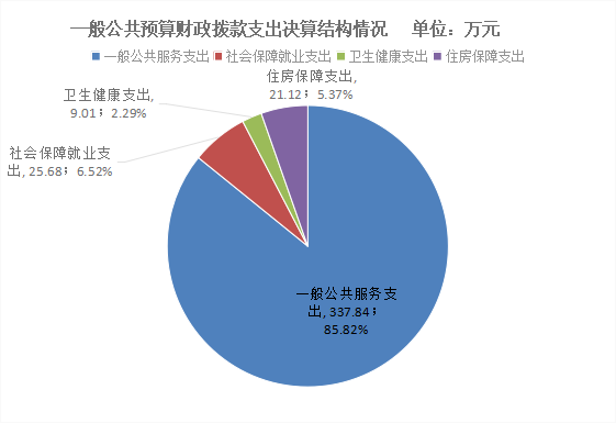 2024年度一般公共预算财政拨款支出393.65万元,主要用于以下方面:一般公共服务支出337.84 万元,占85.82%;社会保障和就业支出25.68万元,占6.52%;卫生健康支出9.01万元,占2.29%;住房保障支出21.12万元,占5.37%。