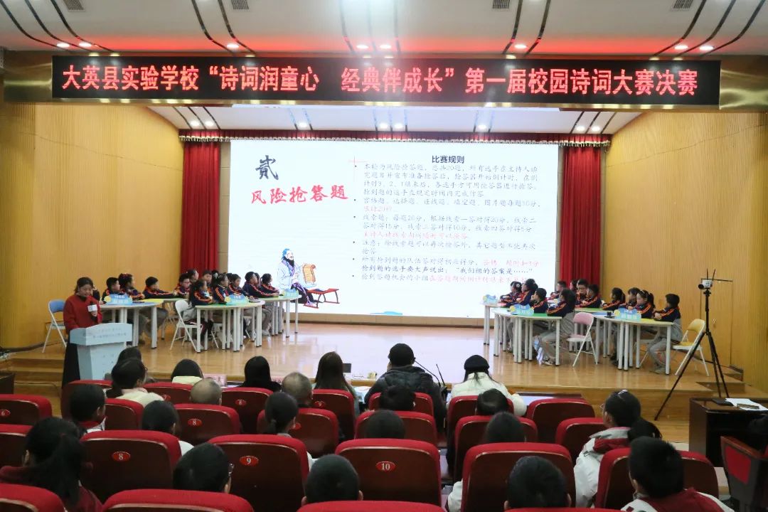大英县实验学校“诗词润童心 经典伴成长”第一届校园诗词大赛决赛在学校德润厅如期开展。活动由六年级语文老师李娜主持,采取现场加直播的方式进行展示。