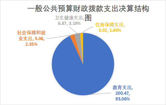 2024年度一般公共预算财政拨款支出215.43万元,主要用于以下方面:教育支出200.47万元,占93.06%;社会保障和就业支出5.06万元,占2.35%;卫生健康支出6.87万元,占3.19%;住房保障支出3.02万元,占1.40%。