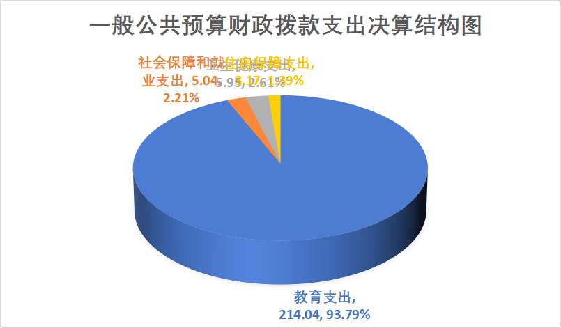 2024年度一般公共预算财政拨款支出228.20万元,主要用于以下方面:教育支出214.04万元,占93.79%;社会保障和就业支出5.04万元,占2.21%;卫生健康支出5.95万元,占2.61%;住房保障支出3.17万元,占4.4%。