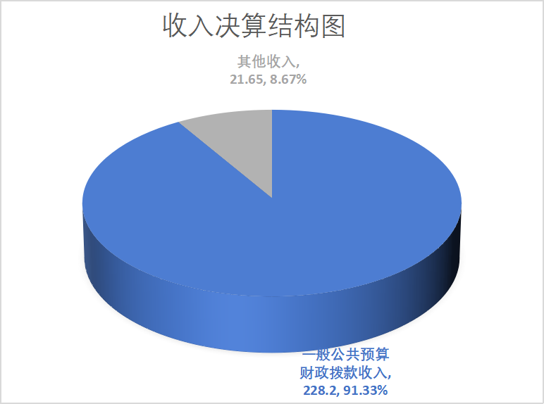 2024年度本年收入合计249.85万元,其中:一般公共预算财政拨款收入228.2万元,占91.33%;政府性基金预算财政拨款收入0万元,占0%;国有资本经营预算财政拨款收入0万元,占0%;上级补助收入0万元,占0%;事业收入0万元,占0%;经营收入0万元,占0%;附属单位上缴收入0万元,占0%;其他收入21.65万元,占10.35%;年初结转和结余收入0万元,占0%。