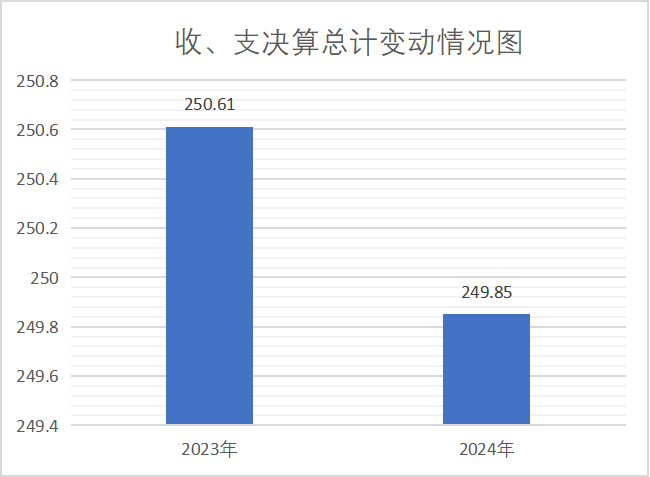 2024年度收、支总计均为249.85万元。与2023年度收、支总计250.61万元相比,收、支总计各减少0.76万元,减少0.30%。主要变动原因是在编教师减少及大型维修减少。