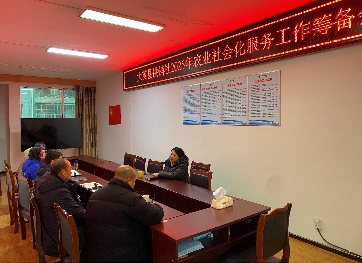 2025年2月21日,大英县供销社组织裕农农业生产资料有限公司、回马供销社等4家社会化服务名录库在库单位召开农业社会化服务会议,深入学习贯彻市委农村工作会议要求,总结2024年农业社会化服务工作经验与不足,谋划2025年农业社会化服务工作重点,进一步推动农业社会化服务高质量发展,助力乡村振兴。