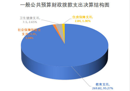 2024年一般公共预算财政拨款支出283.21万元,主要用于以下方面:教育支出(类)269.82万元,占95.27%;社会保障和就业(类)支出3.05万元,占1.08%;卫生健康(类)支出7.5万元,占2.65%;住房保障(类)支出2.84万元,占1%。