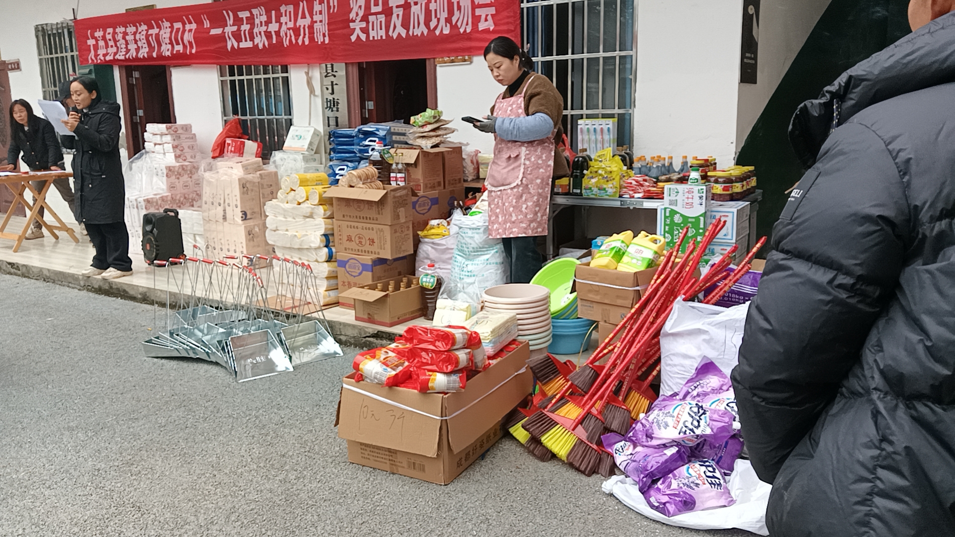 2024年11月23日寸塘口村召开“一长五联+积分制”奖品兑换,合作商超将相应物品送至积分兑换会场,由获奖村民自行选择满意的商品进行兑换。奖品兑换现场,商品琳琅满目,村民笑逐颜开。