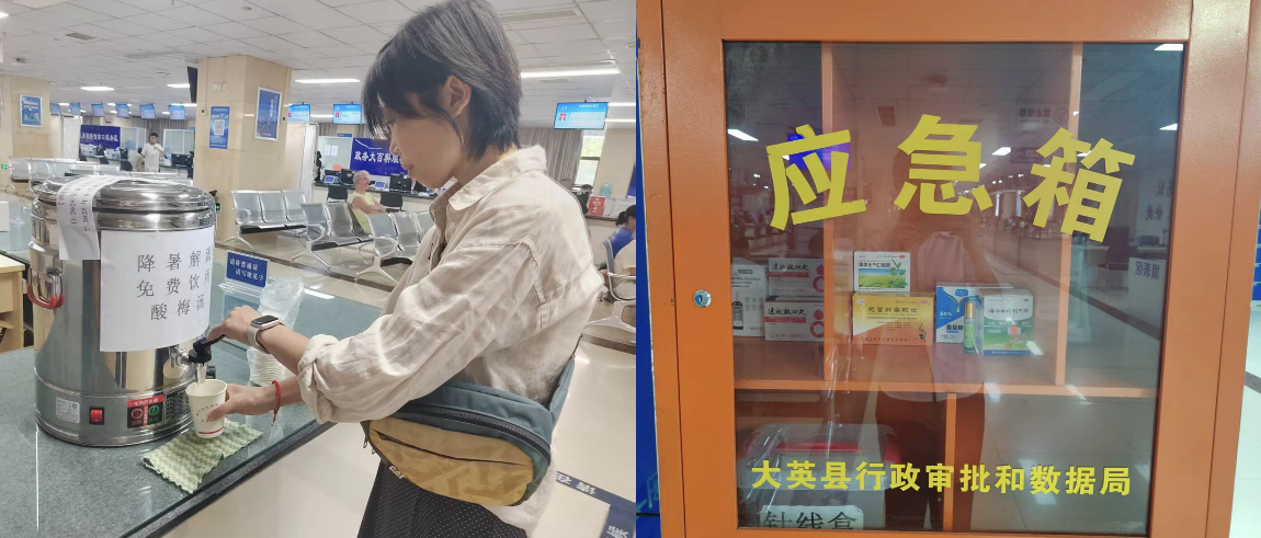 面对暑期高温,在政务服务大厅设立“防暑降温服务点”,每日免费供应解暑酸梅汤。同步配备应急箱,内置风油精、藿香正气水、速效救心丸、创可贴、酒精消毒棉签等基本应急药品,满足群众不时之需。此外,加强空调通风系统维护,确保室内温度适宜,并安排工作人员定时巡查,对出现身体不适的群众及时提供帮助,让群众在炎炎夏日感受政务服务温度。