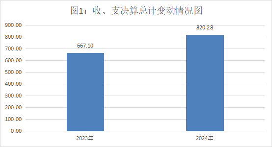 2024年度收、支总计820.28万元。与2023年相比,收、支总计各增加153.18万元,增长22.96%。主要变动原因是增加工资和项目资金增加。