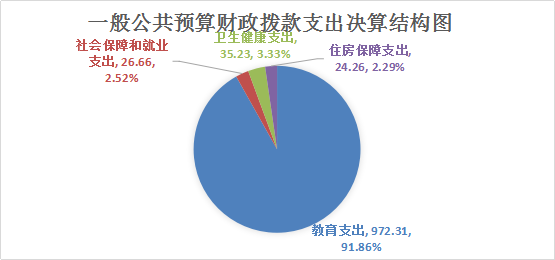 2024年度一般公共预算财政拨款支出1058.46万元,主要用于以下方面:教育支出972.41万元,占91.86%;社会保障和就业支出26.66万元,占2.52%;卫生健康支出35.23万元,占3.33%;住房保障支出24.26万元,占2.29%。