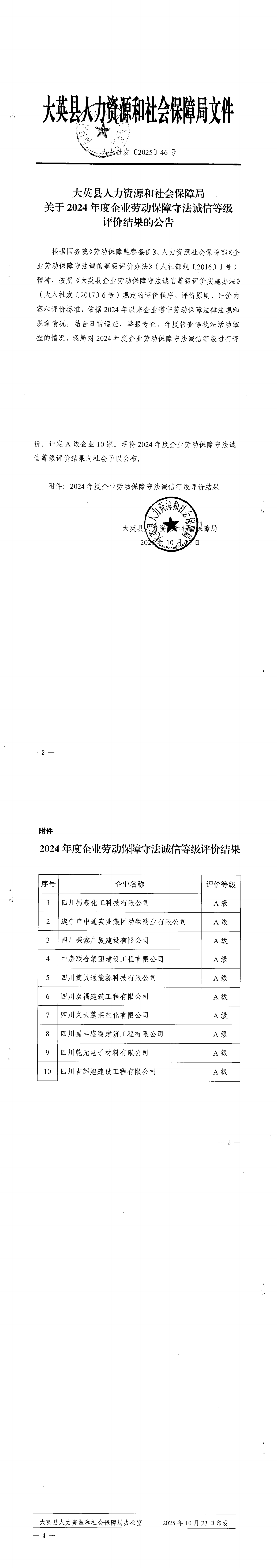 大英县人力资源和社会保障局关于2024年度企业劳动保障守法诚信等级评价结果的公告