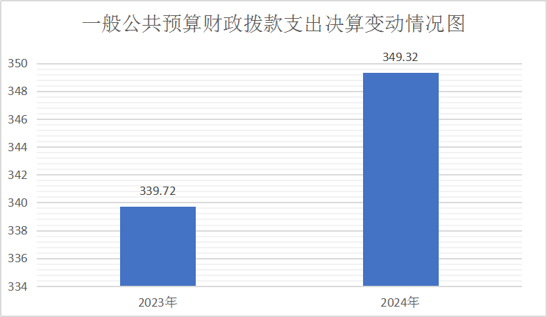 2024年一般公共预算财政拨款支出349.32万元,占本年支出合计的95.83%。与2023年339.72万元相比,一般公共预算财政拨款支出减增加9.6万元,增加8.23%。主要变动原因是本年度在职人员的工资增加,一般公共预算财政拨款支出增加。