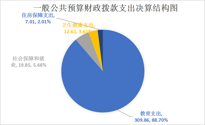 2024年一般公共预算财政拨款支出349.32万元,主要用于以下方面:教育支出(类)309.86 万元,占88.70%;社会保障和就业(类)支出19.85万元,占5.68%;卫生健康(类)支出12.61万元,占3.61%;住房保障(类)支出7.01万元,占2.01%。