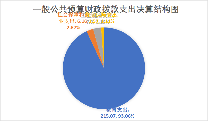 2024年度一般公共预算财政拨款支出231.1万元,主要用于以下方面:教育支出215.07万元,占93.06%;社会保障和就业支出6.16万元,占2.67%;卫生健康支出7.3万元,占3.16%;住房保障支出2.57万元,占1.11%。